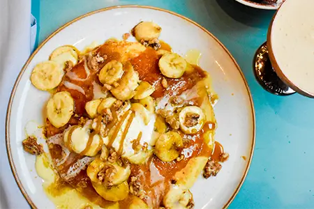 Sweet Cream Batter, Caramelized Bananas, Caramel, Meyers Dark Rum Sauce, Candied Walnuts & Cream Cheese Anglaise