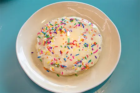 Two sweet cream and sprinkle cakes topped with cream cheese anglaise & sprinkles