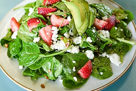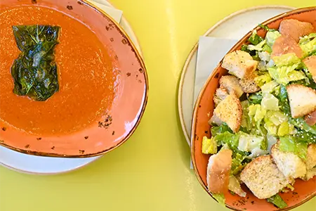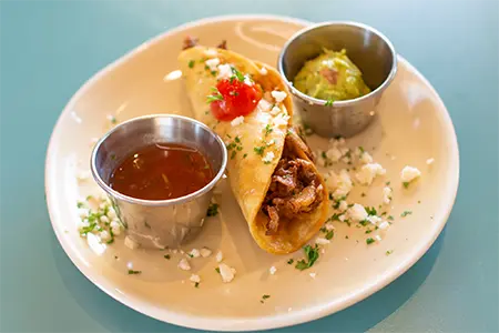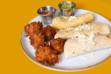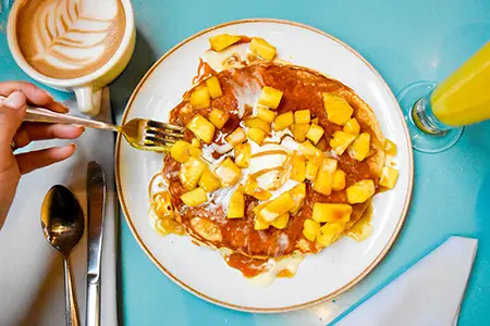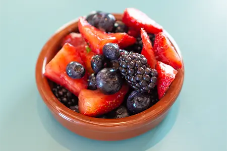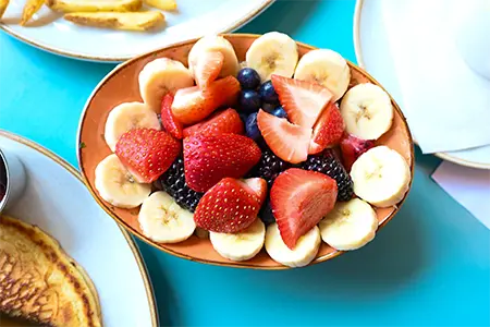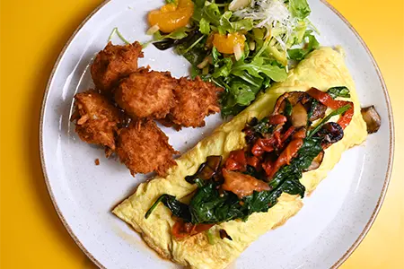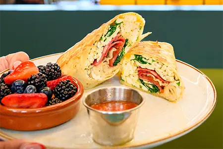 Egg Whites, Sautéed Spinach, Smoked Cheddar, Turkey Bacon & Sidecar Salsa, toasted in a Flour Tortilla, served with Fresh Fruit