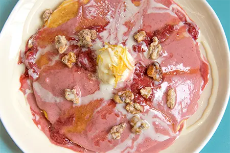 Sweet Cream Batter, Strawberry Compote, Candied Walnuts, Cream Cheese Anglaise & Candied Lemon