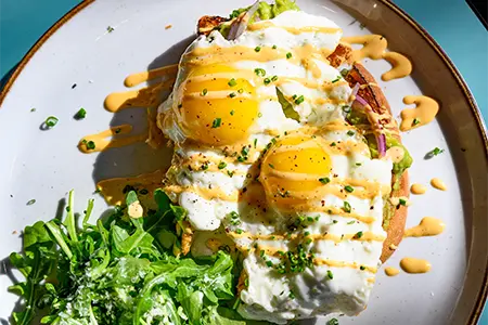 Toasted Sourdough, Guacamole, 2 Sunny Side Up Eggs, Red Onions, Chipotle Hollandaise & Chives