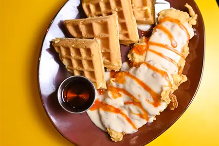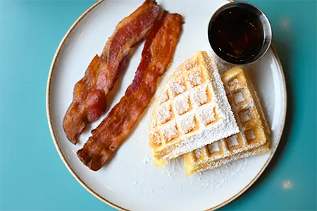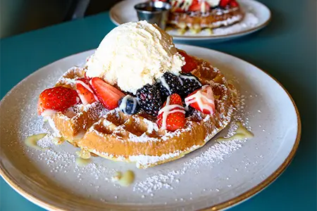 Gluten-Free Available! Belgian Batter, Cream Cheese Anglaise, Powdered Sugar, House-made Whipped Cream, Fresh Berries & Warm Syrup
