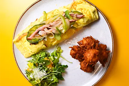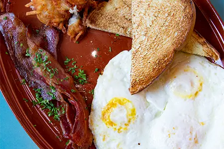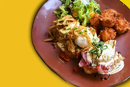Toasted Sourdough, Grilled Duroc Ham, Chorizo, Sautéed Peppers & Onions, Smoked Cheddar Hollandaise & Pepper Jelly