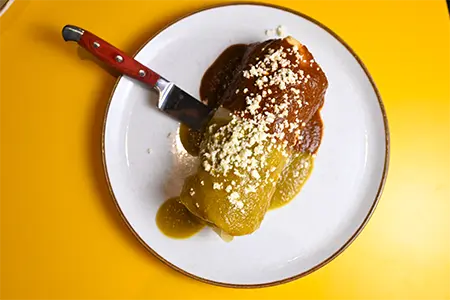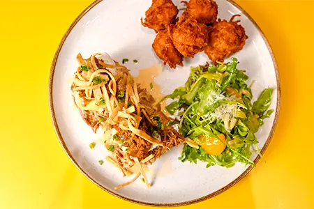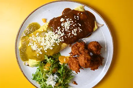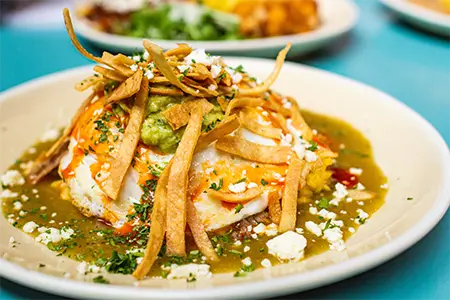 Griddled Grit Cake, Beer Braised Pork, Chipotle Hollandaise, Chorizo, Red Chili Sauce, Crispy Tortilla Strips & Chives