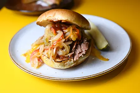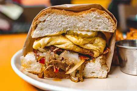 Pressed Torta Bread, Grilled Duroc Ham, Bacon, Egg, Swiss, Pickles, Beer Braised Pork, Sautéed Peppers & Onions & Dijon Cream