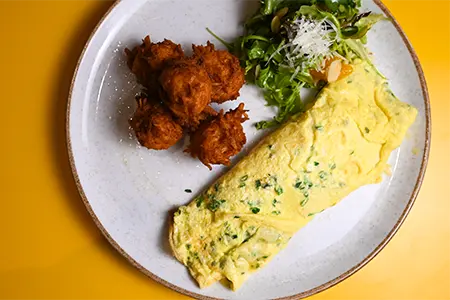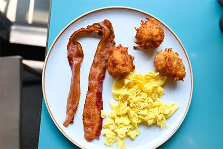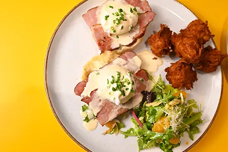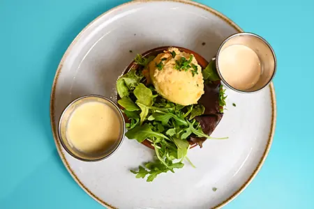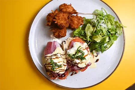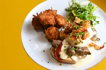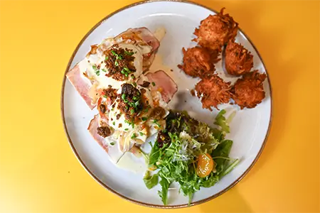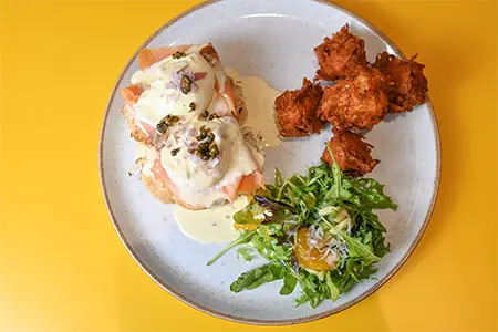 Toasted Sourdough, Cold Smoked Salmon, Honey Boursin, Shallots, Fried Capers & Cream Cheese Hollandaise