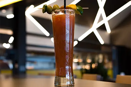 Vodka, Bloody Mary Mix, Pickle Juice, Tabasco, Grilled Cheese Bite, Lemon, Lime, Olive