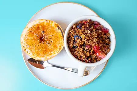 House-made Granola, Layered with Vanilla Greek Yogurt & Fresh Berries. served with a Brûléed Grapefruit