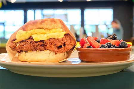 Spicy Hand-Breaded Chicken Breast, Smoked Cheddar, Egg & Spicy Mayo on a Flaky Buttermilk Biscuit